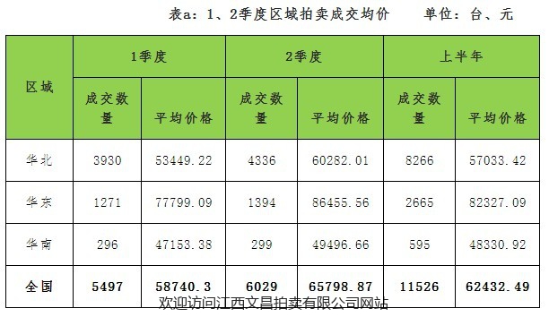 從標(biāo)的車(chē)輛拍賣(mài)成交價(jià)格看,全國(guó)樣本統(tǒng)計(jì)成交均價(jià)1季度為58740.3元,2季度為65798.9元。從區(qū)域看,拍賣(mài)成交均價(jià)由高至低依次是華東、華北、華南。